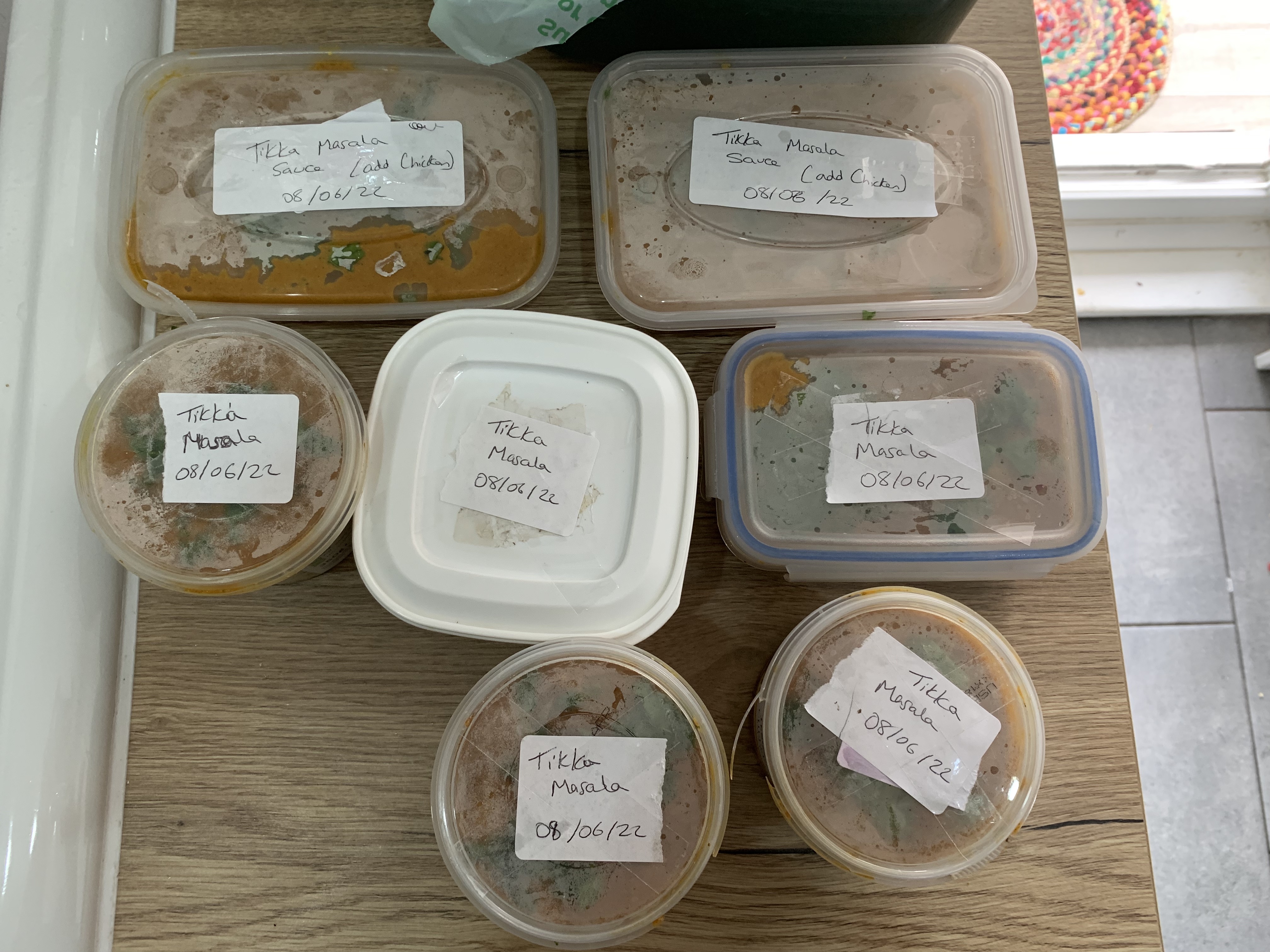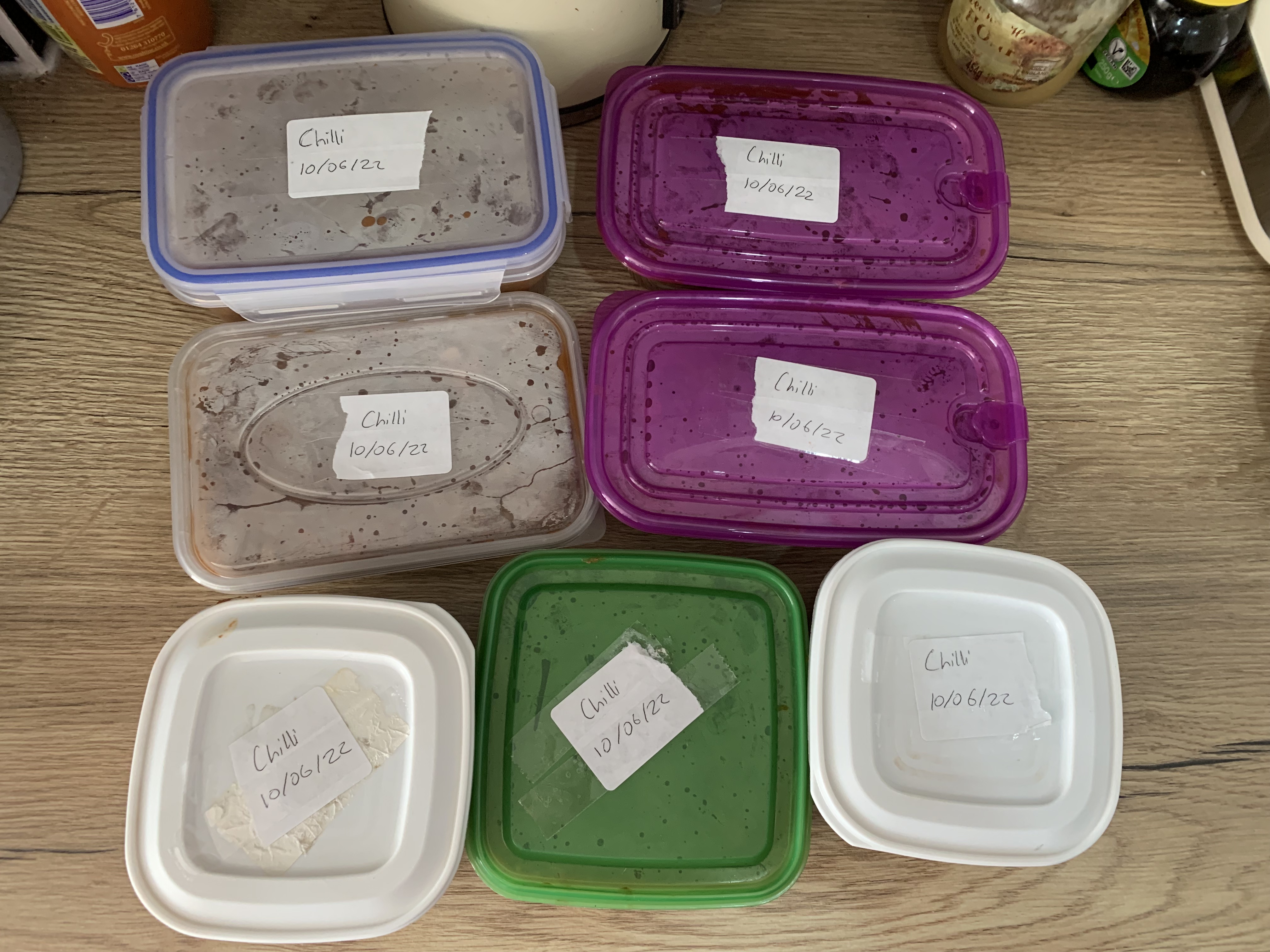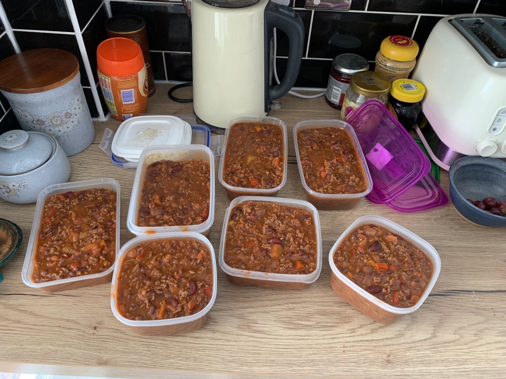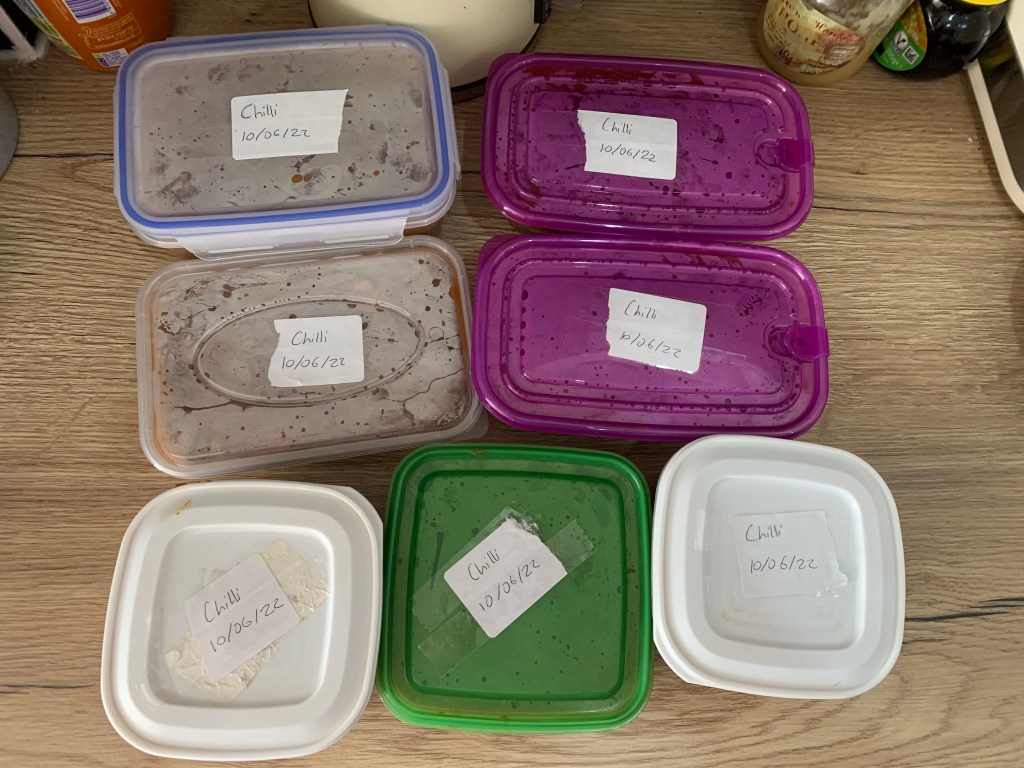 I got 7 tubs out of this batch so that’s roughly 14-15 portions and at least 7 dinners for my family. We are unlikely to have chilli 7 times in one month so this will do us for June and July.