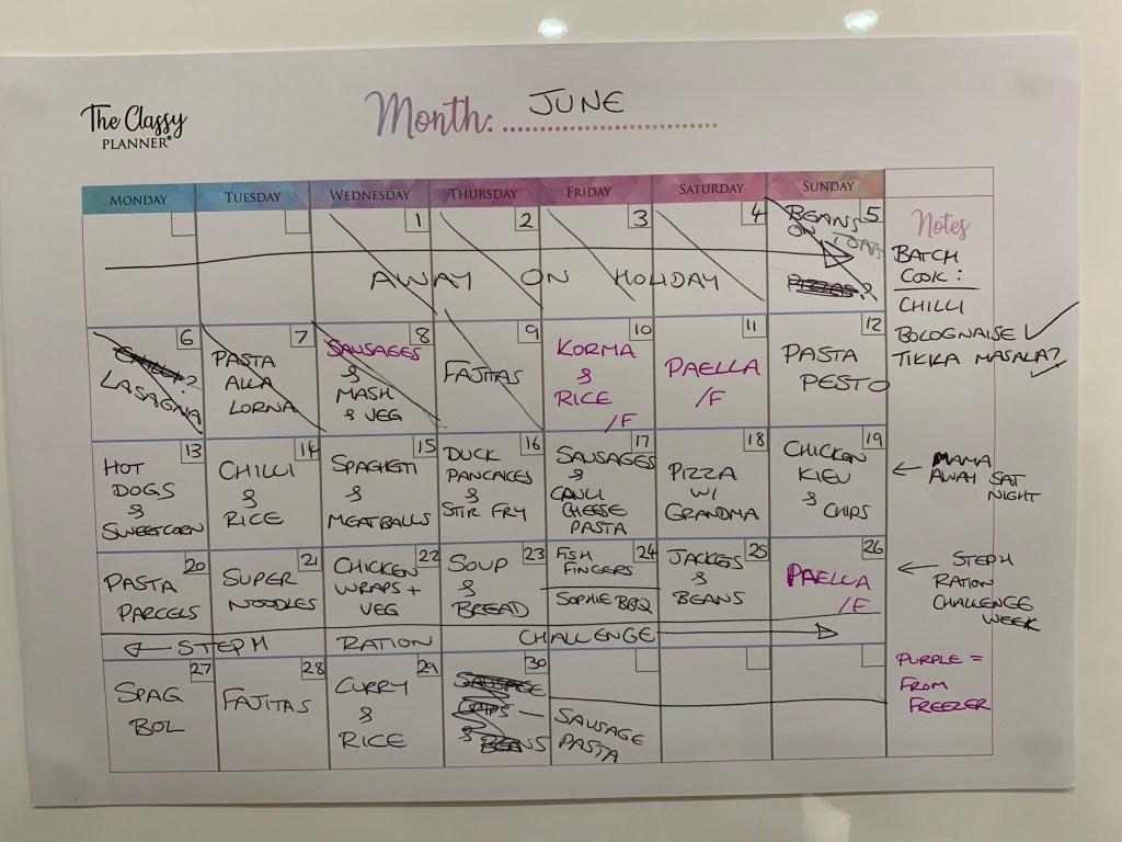 It’s worth mentioning that when I batch-cook I make deliberately large quantities that would normally last us more than a month, so for example looking at the plan I know I have enough paella in the freezer for 2 dinners and it needs using up so those are planned as frozen rather than fresh meals. I also needed to batch cook chilli, bolognaise and tikka masala, but the quantities I made should be enough for at least 2 months.