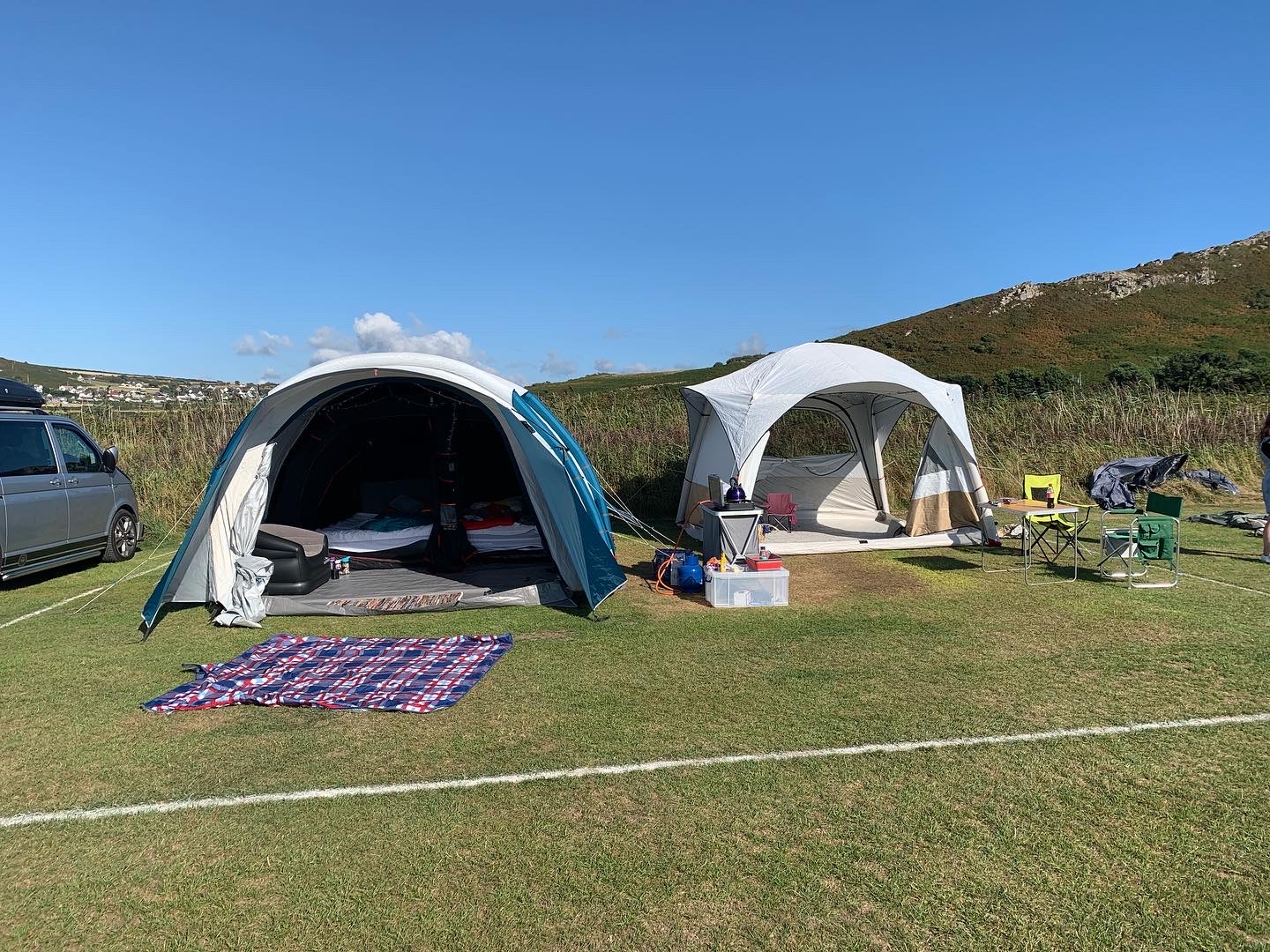 Here is my spacious 5-man tent and gazebo….. (both are air tents as on consultation with single parent friends these ones are the easiest to put up on your own – no poles needed!). They are amazing and I can confirm that I can put it up on my own in about 15-20 mins – VERY easily and with no fuss. HIGHLY recommend an Air Tent in case you are shopping for tents… Mine are both Quechua ones but I believe there are other brands with a similar function these days.