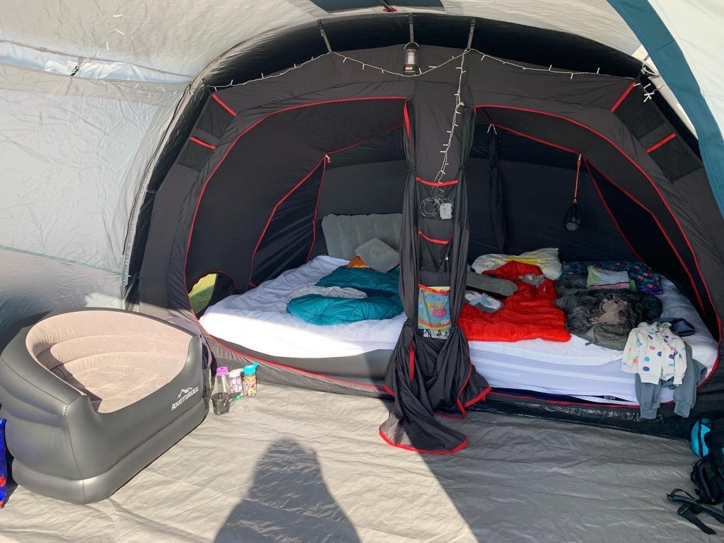 Here is my spacious 5-man tent and gazebo….. (both are air tents as on consultation with single parent friends these ones are the easiest to put up on your own – no poles needed!). They are amazing and I can confirm that I can put it up on my own in about 15-20 mins – VERY easily and with no fuss. HIGHLY recommend an Air Tent in case you are shopping for tents… Mine are both Quechua ones but I believe there are other brands with a similar function these days.