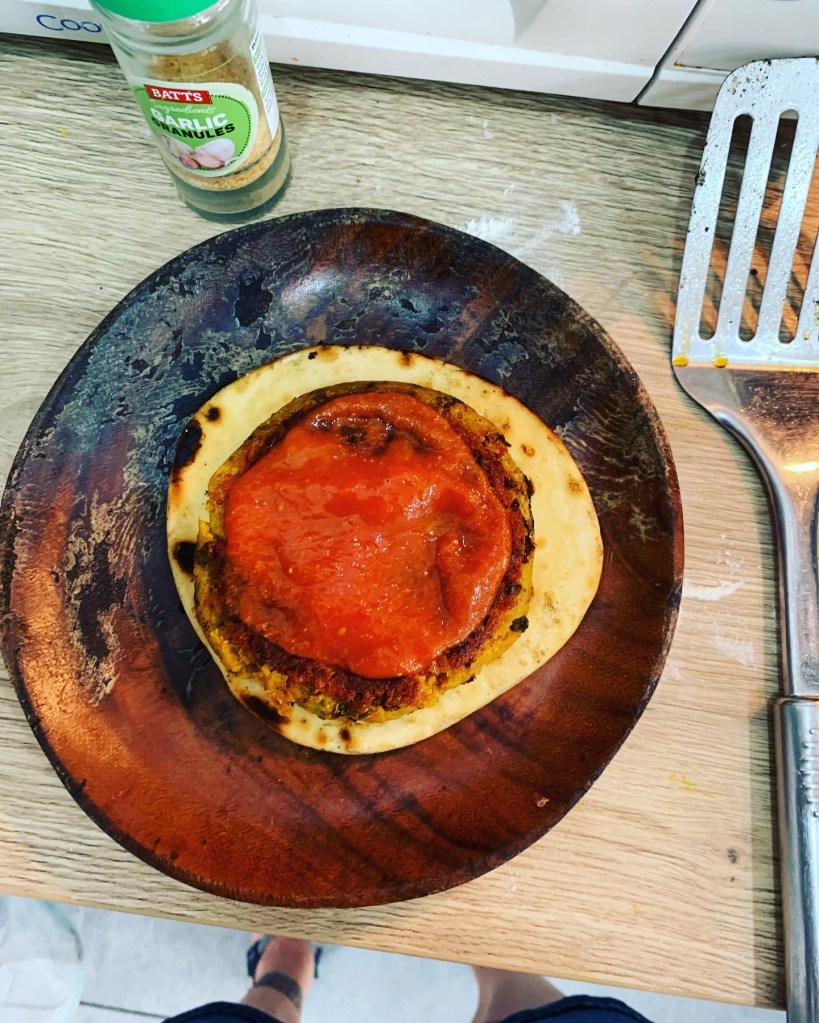 Dinner was another lentil and bean burger with flatbreads and ketchup – very delicious!