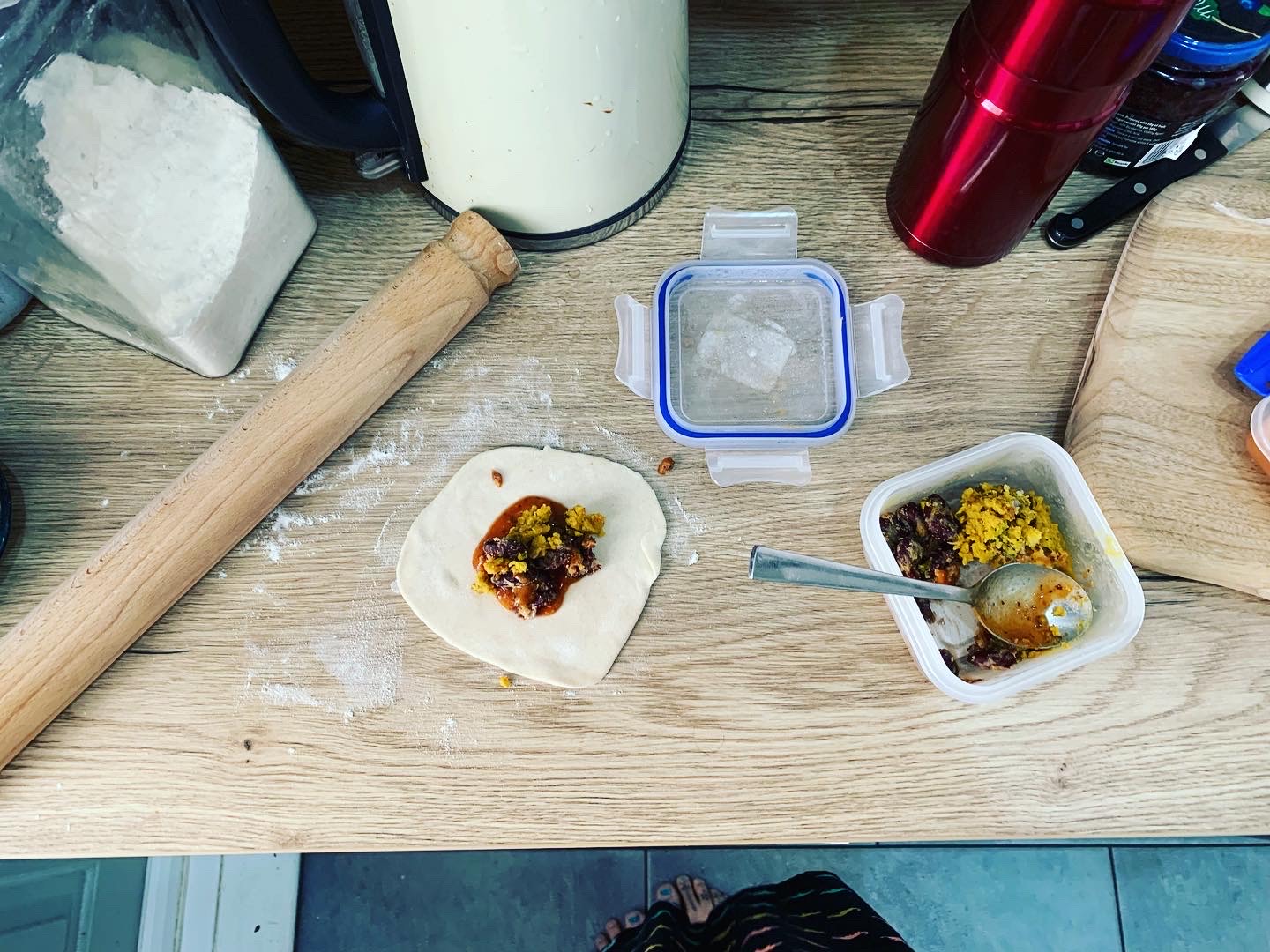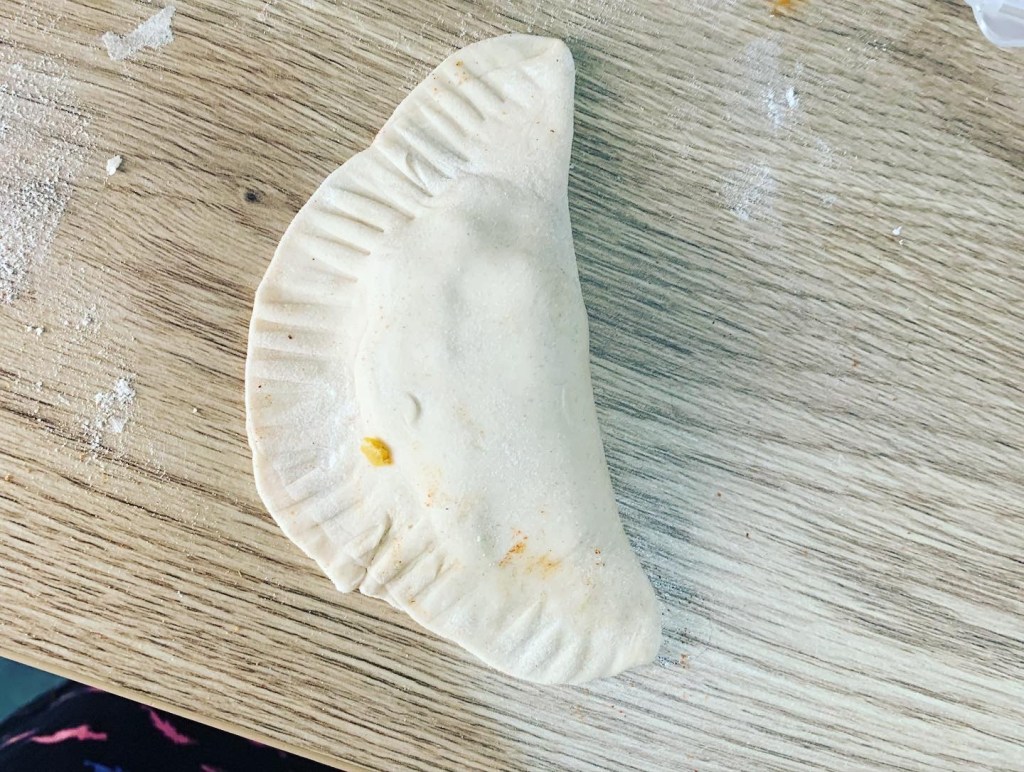 Lunch was another stir-fry with spring onion and chorizo but I used a bit more oil this time so it was a bit greasy but still good – lots more spices added to make it taste nice! I also tried a little experiment – I made a tiny pasty/samosa with a bit of my bean burger mixture and some spices, beannaise sauce and some leftover flatbread dough – it was DELICIOUS!!