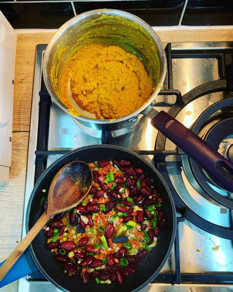 Although I felt really sluggish and tired this morning, and not very hungry, by the afternoon my appetite was back and I REALLY enjoyed making and eating my lentil and bean burgers! I have learnt my lesson from last year and avoided adding too much water – the recipe amount isn’t quite right and they were too wet last time! This time the lentil mixture was nice and firm and I fried up my kidney beans with some chorizo and spring onion and a few spices.