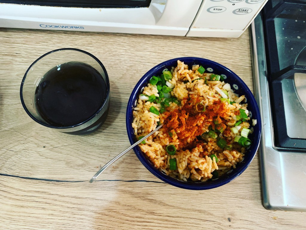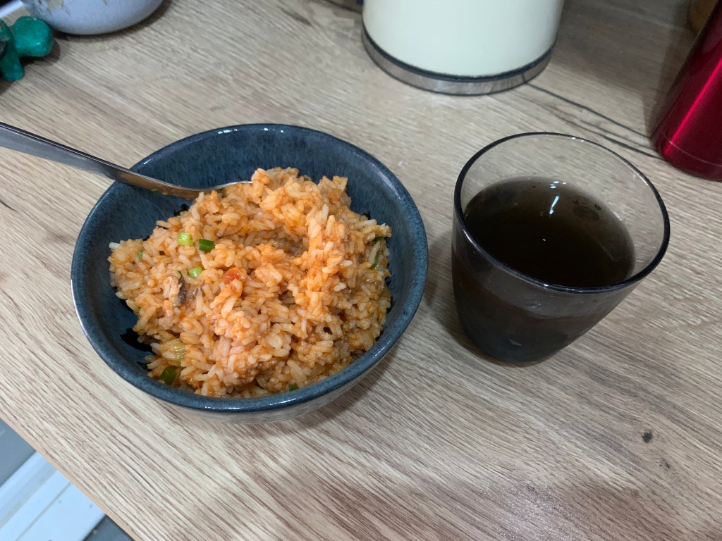 For lunch: More rice with a small half of a sardine and some beany sauce and a bit of spring onion, along with some salt, paprika and chilli powder. Delicious and very filling. I also had some of my cold fruit tea which was lovely! Fresh and tasted lovely! Again I usually don’t get much flavour from a fruit teabag on 2nd usage but leaving it to soak overnight seems to have helped a lot.