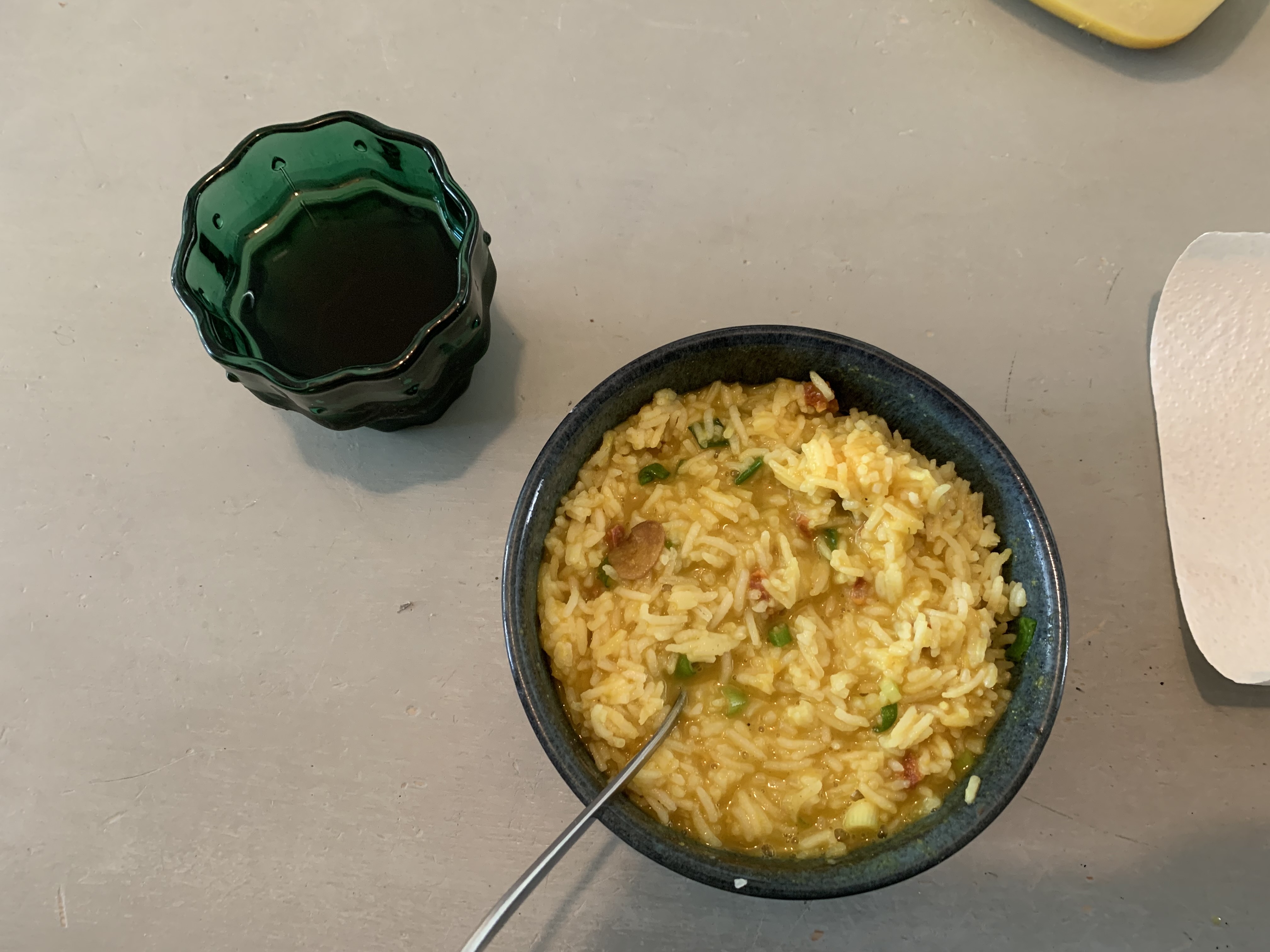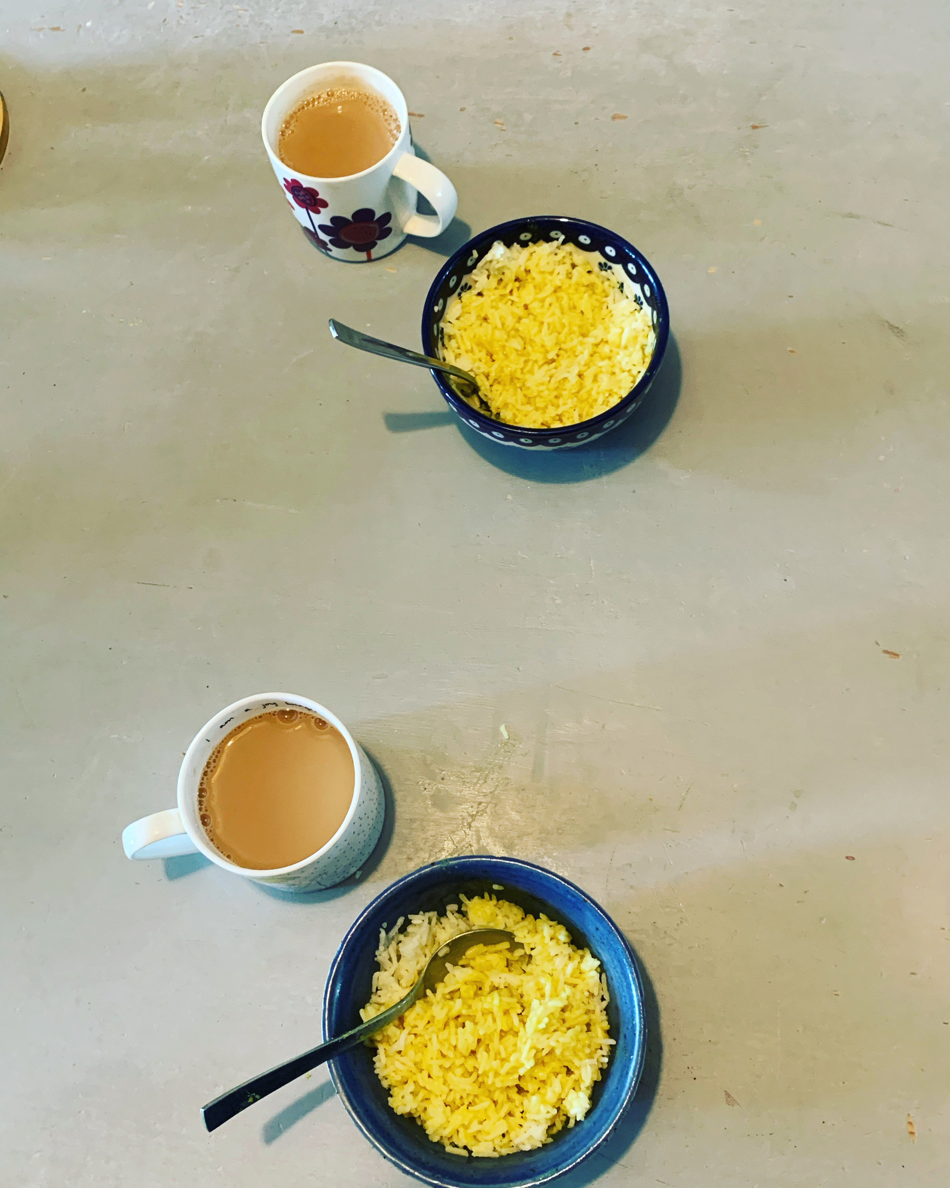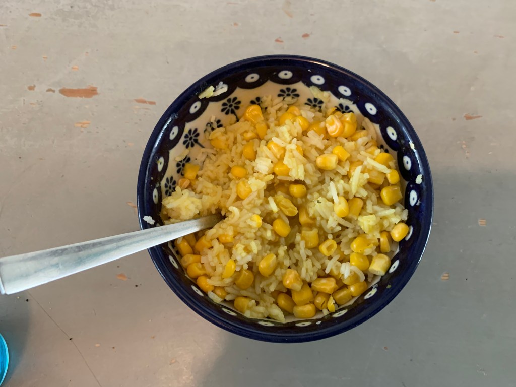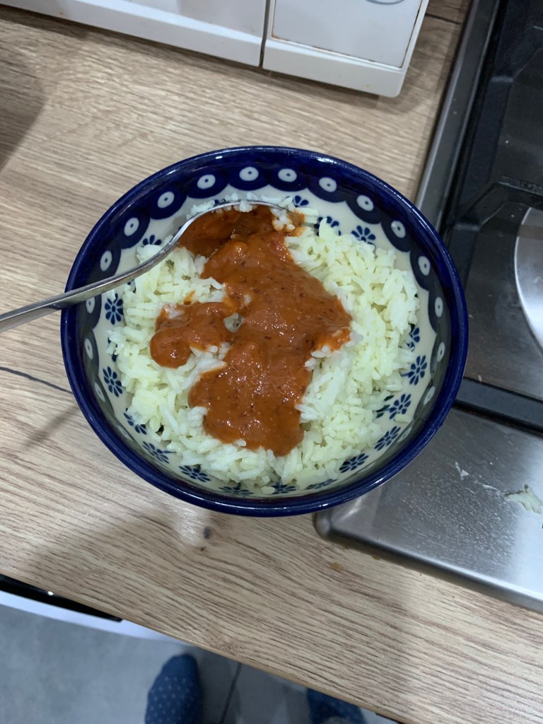 Had a late brekkie of rice and water. I cooked my rice last night with both chicken stock and turmeric so it’s a lovely bright yellow and very cheerful. The colour (and flavour) helps with the monotony of rice! Tiny drizzle of beannaise sauce on it but trying to save the rest if I can.