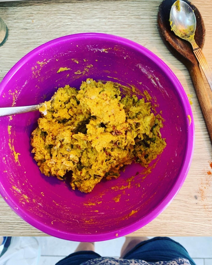 Mashed it all together… (and set a little aside for another treat – a kind of flatbread pasty that I want to make another day!)
