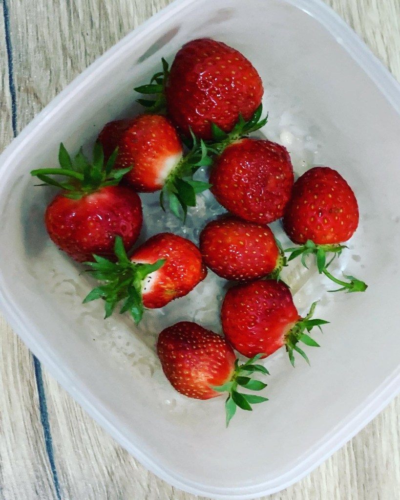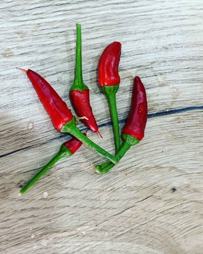 We harvested our first strawberries from the garden today, which of course I couldn’t eat but the girls informed me they were delicious! I also picked some tiny ripe chillis from my chilli plant.