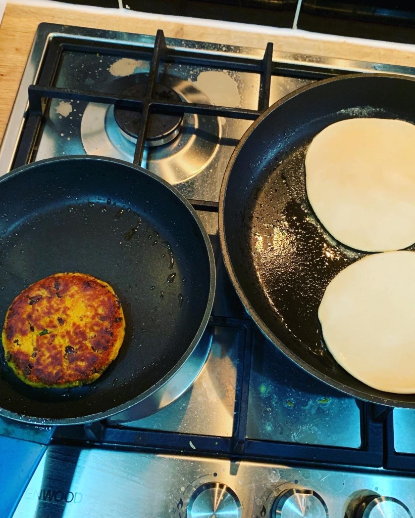 This time it made a nice firm patty and it fried up really well, though my flatbreads were not great – the pan wasn’t hot enough so they didn’t puff up well and weren’t rolled thin enough.