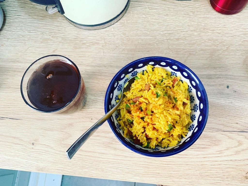 For lunch I stir-fried some more of my cheerful bright yellow rice with some oil, chorizo, spring onions and spices. And a glass of cold fruit tea.