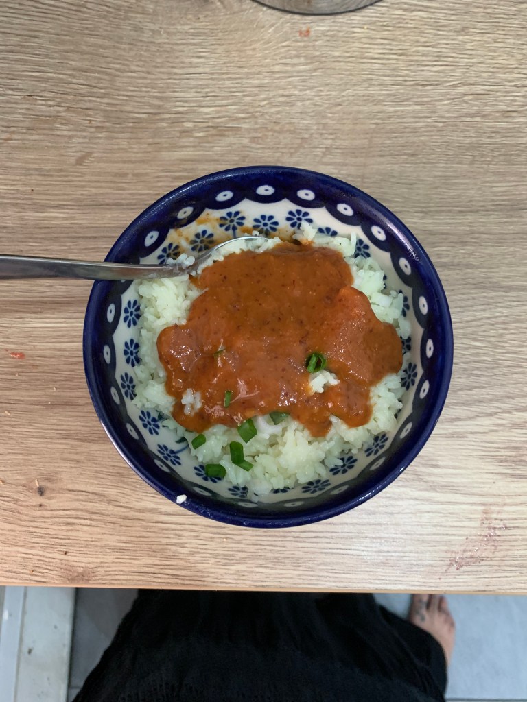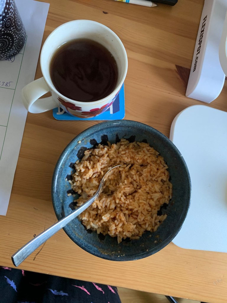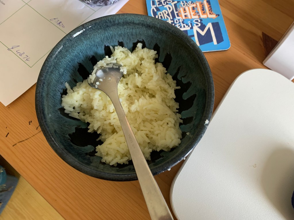 There is LOADS of rice left in the fridge this time around (partly because I cooked S’s rations too) so will be eating a fair bit of rice next week too.