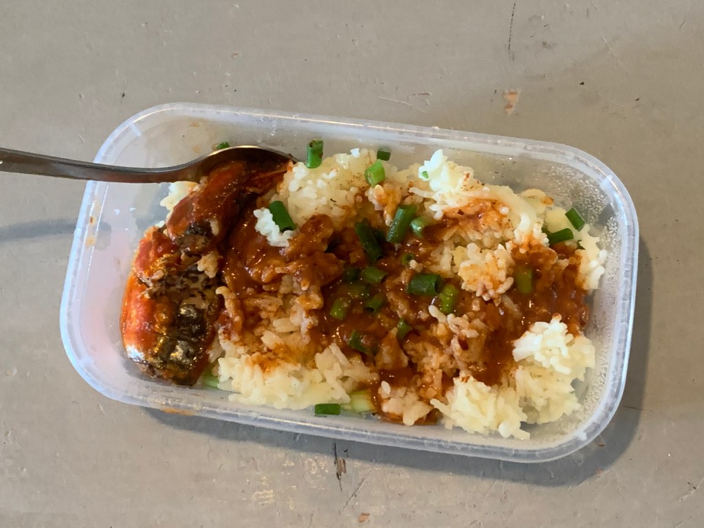 For lunch I ate a little more rice with bean sauce, spring onion and a bit of my sardines ration. It was actually delicious and I sprinkled a little salt, chilli powder and paprika on it.