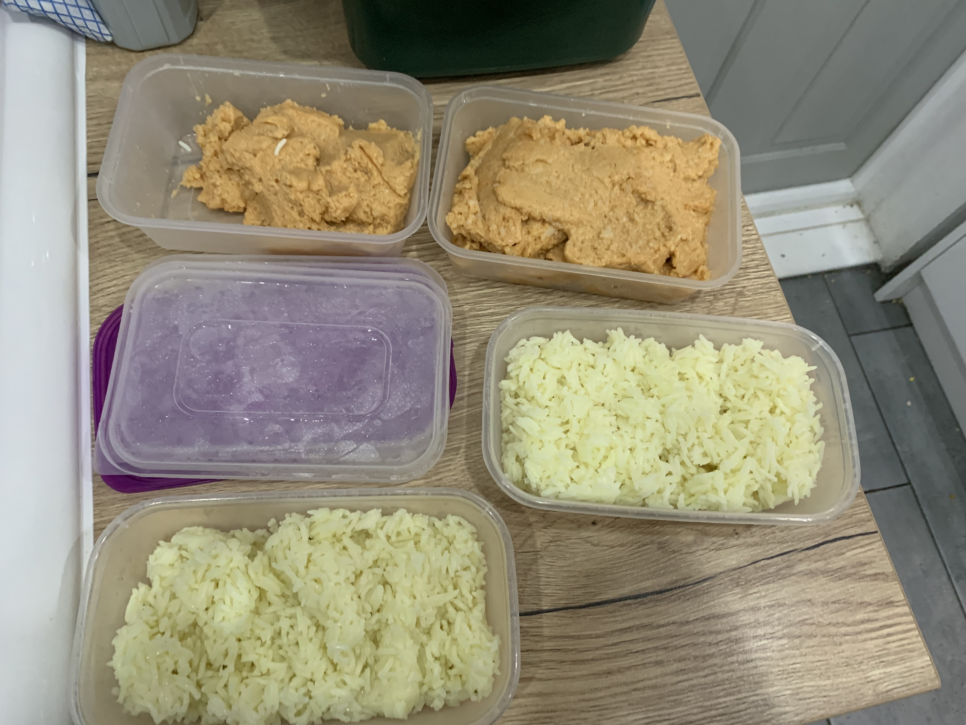 Did a bit more meal prepping yesterday and today – yesterday I cooked an extra ration of rice, blended it in the blender with some oil, water and spices so I have a couple of tubs of it ready to make rice crackers!